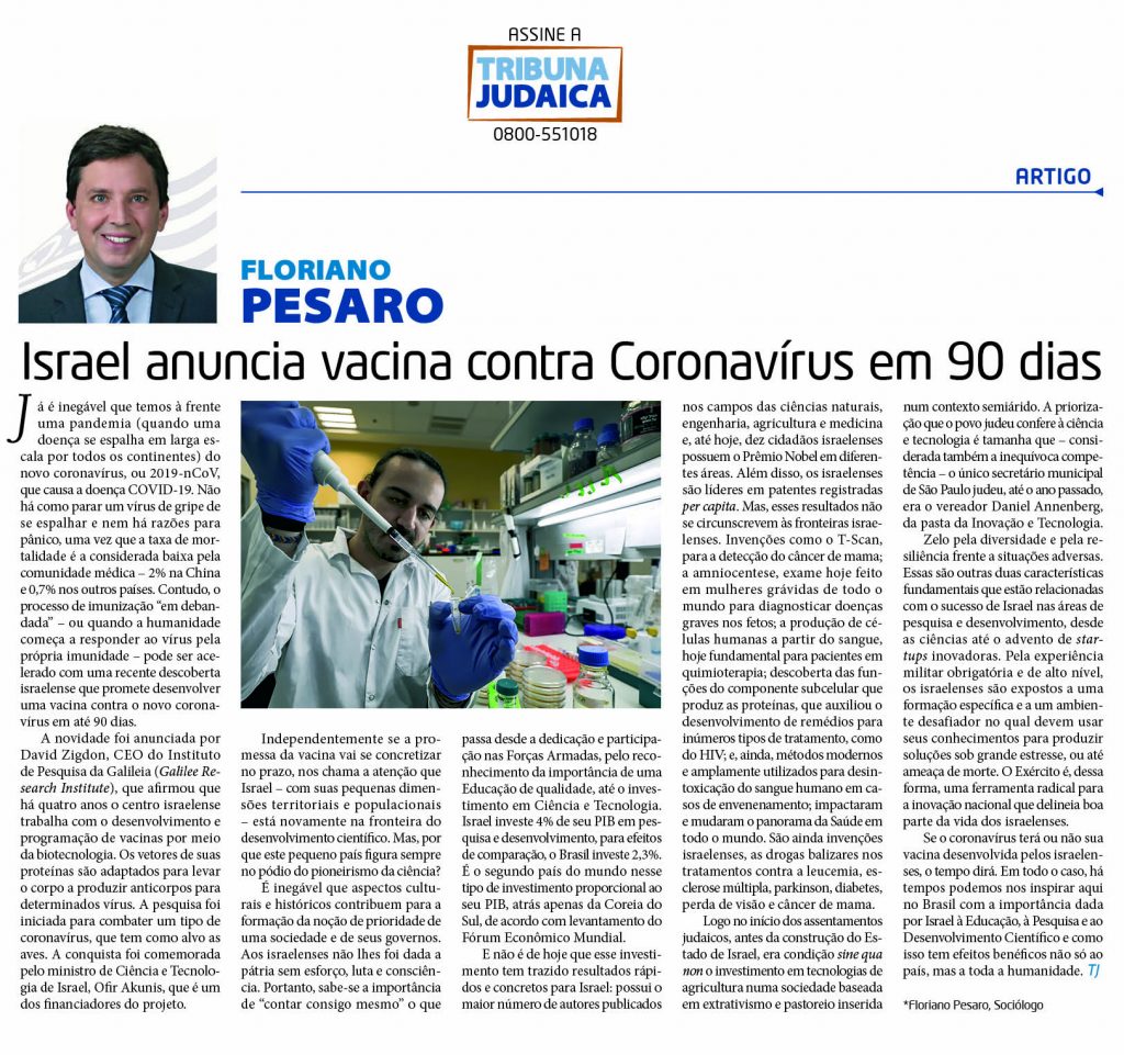 O Exército é, dessa forma, uma ferramenta radical para a inovação nacional que delineia boa parte da vida dos israelenses. Se o coronavírus terá ou não sua vacina desenvolvida pelos israelenses, o tempo dirá. Em todo o caso, há tempos podemos nos inspirar aqui no Brasil com a importância dada por Israel à Educação, à Pesquisa e ao Desenvolvimento Científico e como isso tem efeitos benéficos não só ao país, mas a toda a humanidade.